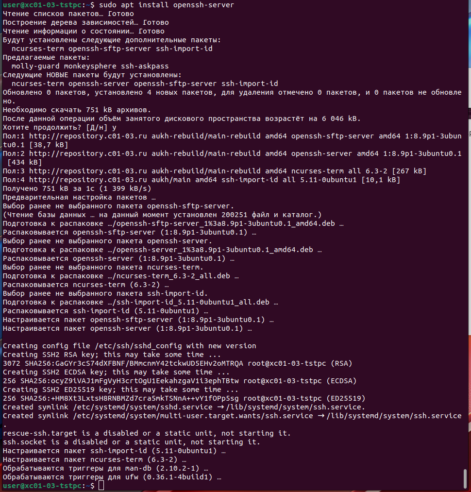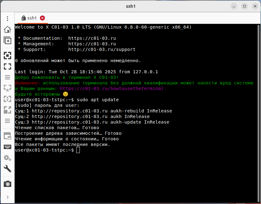 Мы смогли зайти на сервер под пользователем ***, ради проверки запустим обновление системы и приложений через apt: