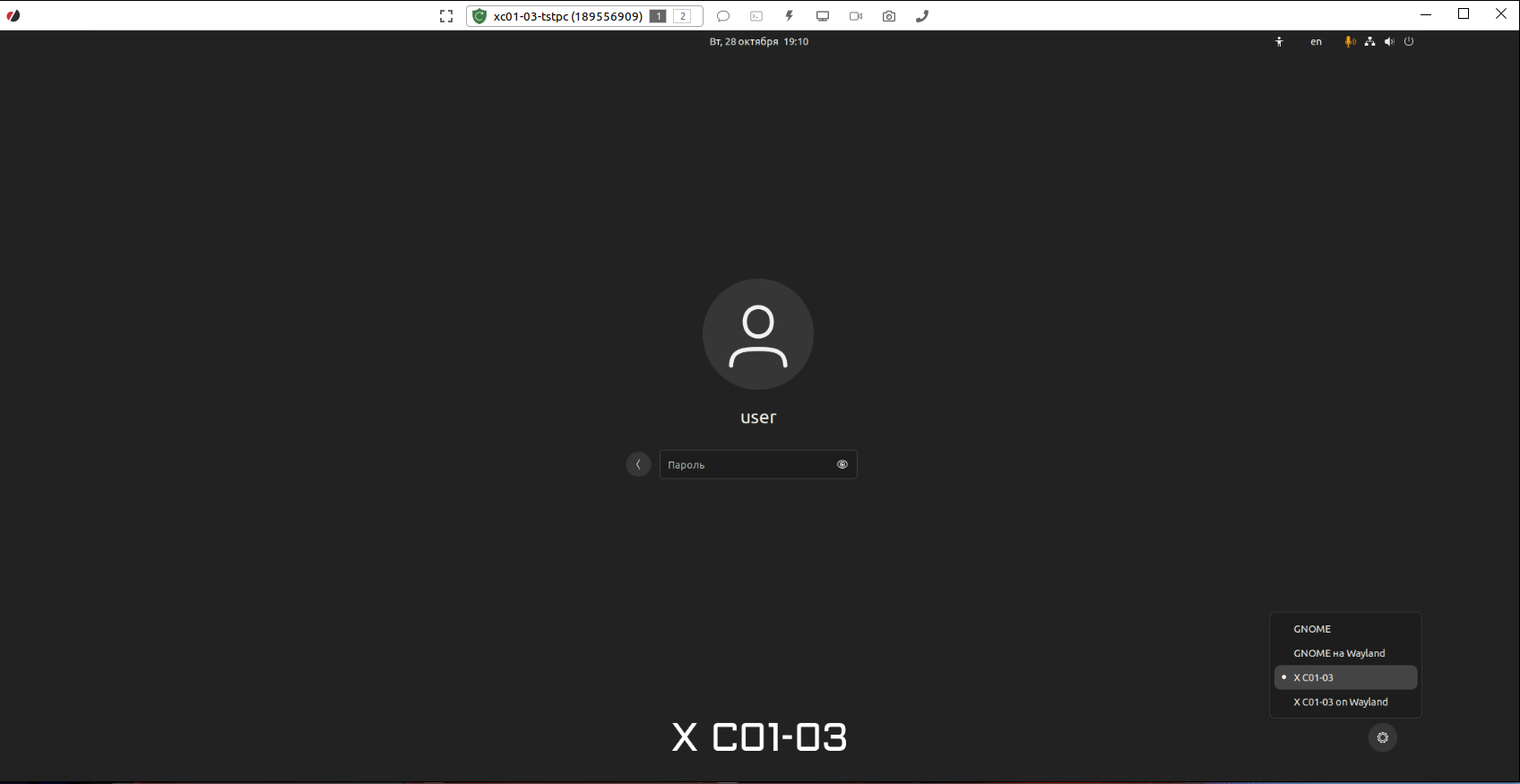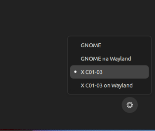 По умолчанию X C01-03 работает с новым графическим сервером Wayland, более эффективным и безопасным, чем X.org (X11). Однако, большая безопасность приводит к невозможности удаленного управления с помощью стороннего ПО. Для того, чтобы проприетарное ПО для удаленного подключения корректно работало, необходимо при входе в систему выбрать загрузку X C01-03 с графическим сервером X.org.