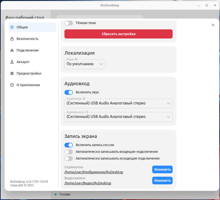 В общих настройках вы можете настроить передачу звука, запись сессии, папки для сохранения записей. Обратите внимание на флаг "Включить службу", если он активирован, RuDesktop будет запускаться как системная служба, и, в случае, если у вас настроен постоянный пароль, вы сможете подключиться к удаленному ПК без локального входа в графическую сессию: