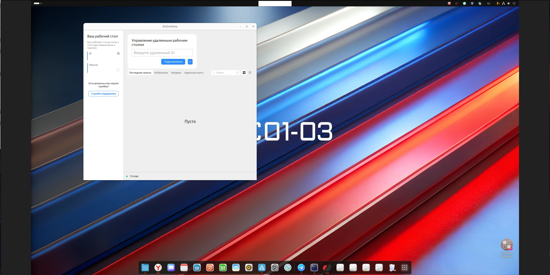 RuDesktop - это российское ПО для удаленного подключения. В X C01-03S его установка производится с помощью deb-пакета с официального сайта https://rudesktop.ru/downloads.
