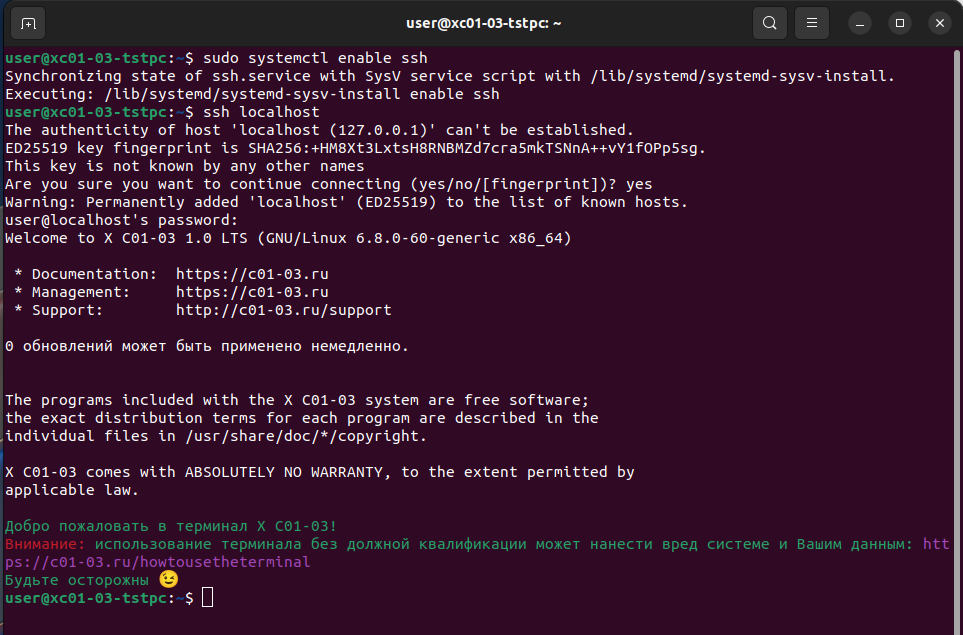 Мы буквально подключились сами к себе. Проверка завершена, выйдем из подключения SSH командой