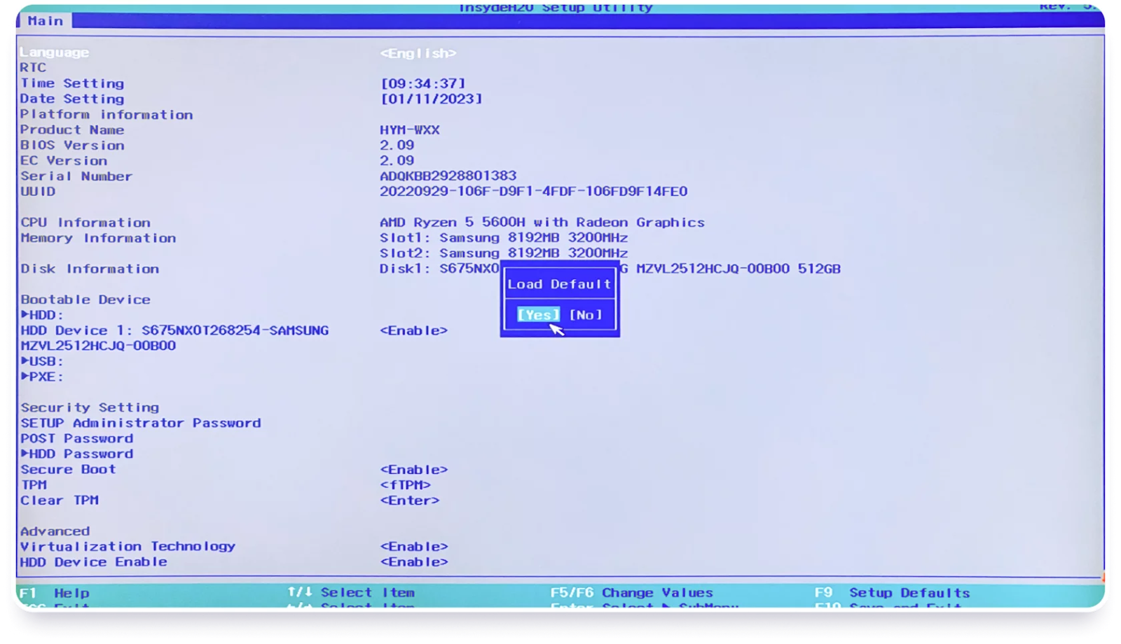 4. Вначале рекомендуем установить стандартные настройки. Для этого нажмите клавишу F9 и затем Enter в появившемся диалоговом окне.