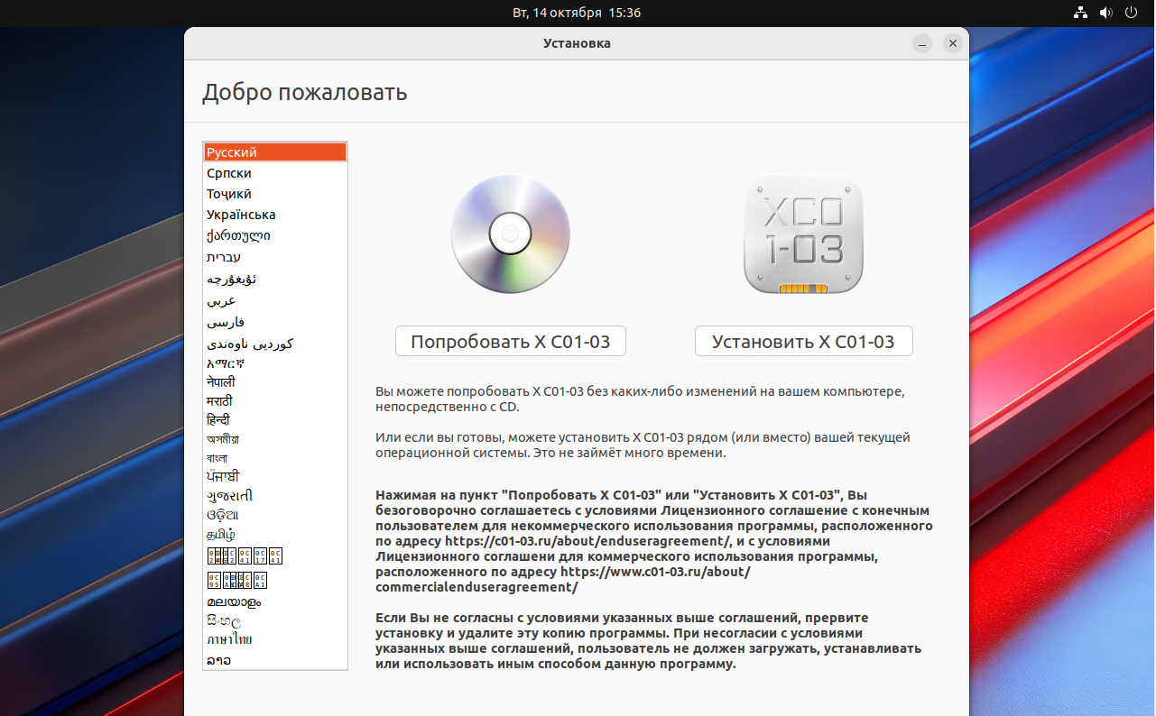 С момента публикации скачанного вами дистрибутива X C01-03 могли выйти обновления, мы рекомендуем не дожидаться автозапуска обновлений и установить их сразу после установки системы.