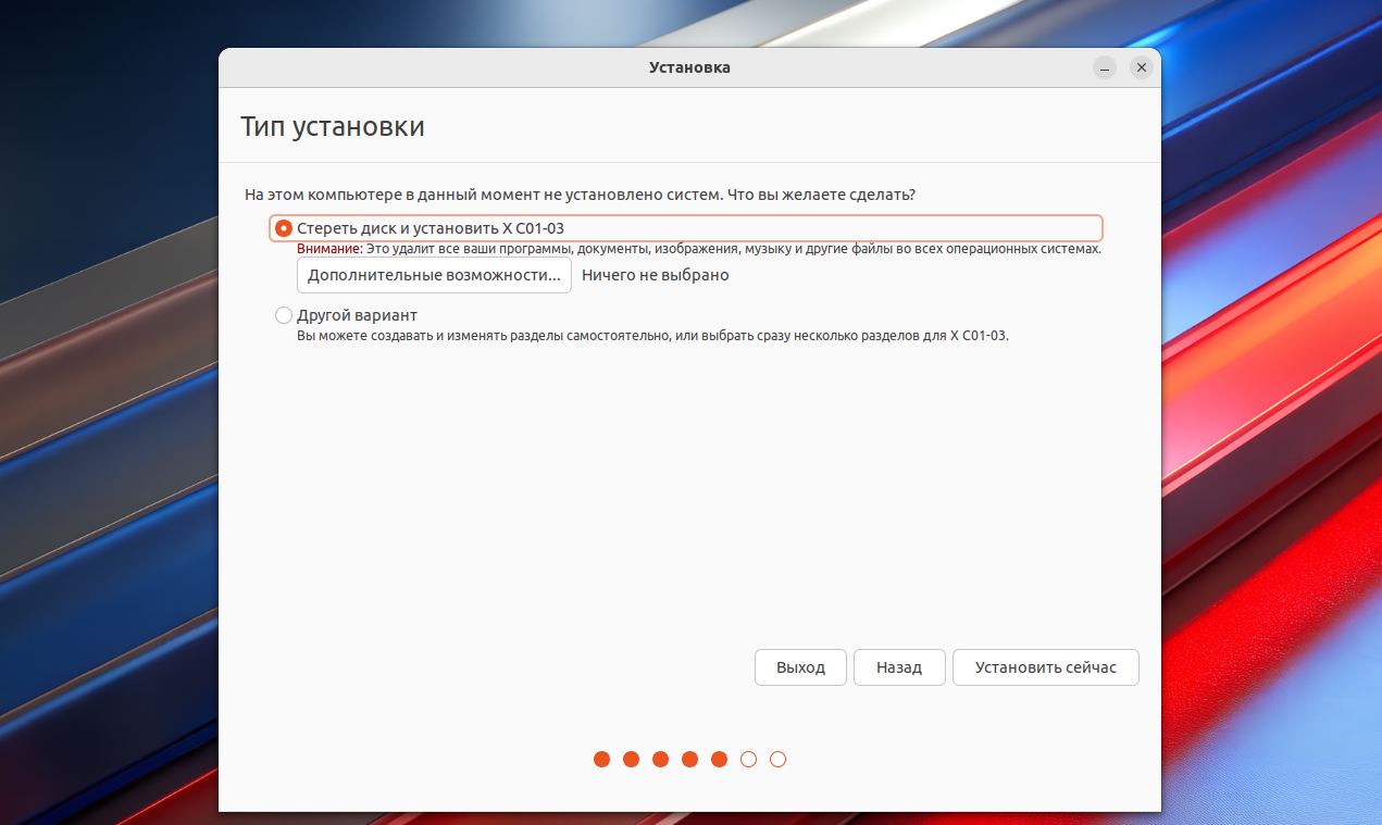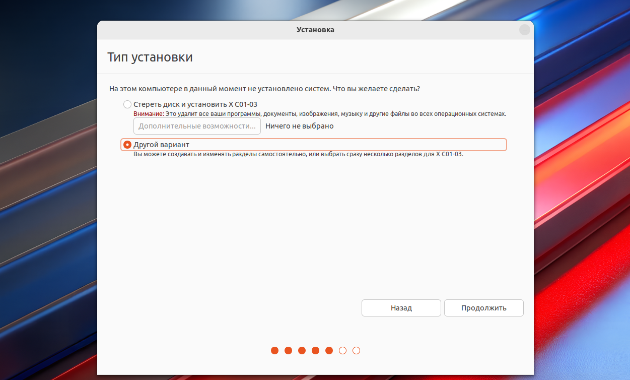 Эту опцию мы рекомендуем для более опытных пользователей, а также для случаев, когда вам необходимо вручную настроить размеры разделов, разделить системные и пользовательские файлы, либо установить X C01-03 совместно с другими ОС на разные физические диски, но с единым загрузчиком.