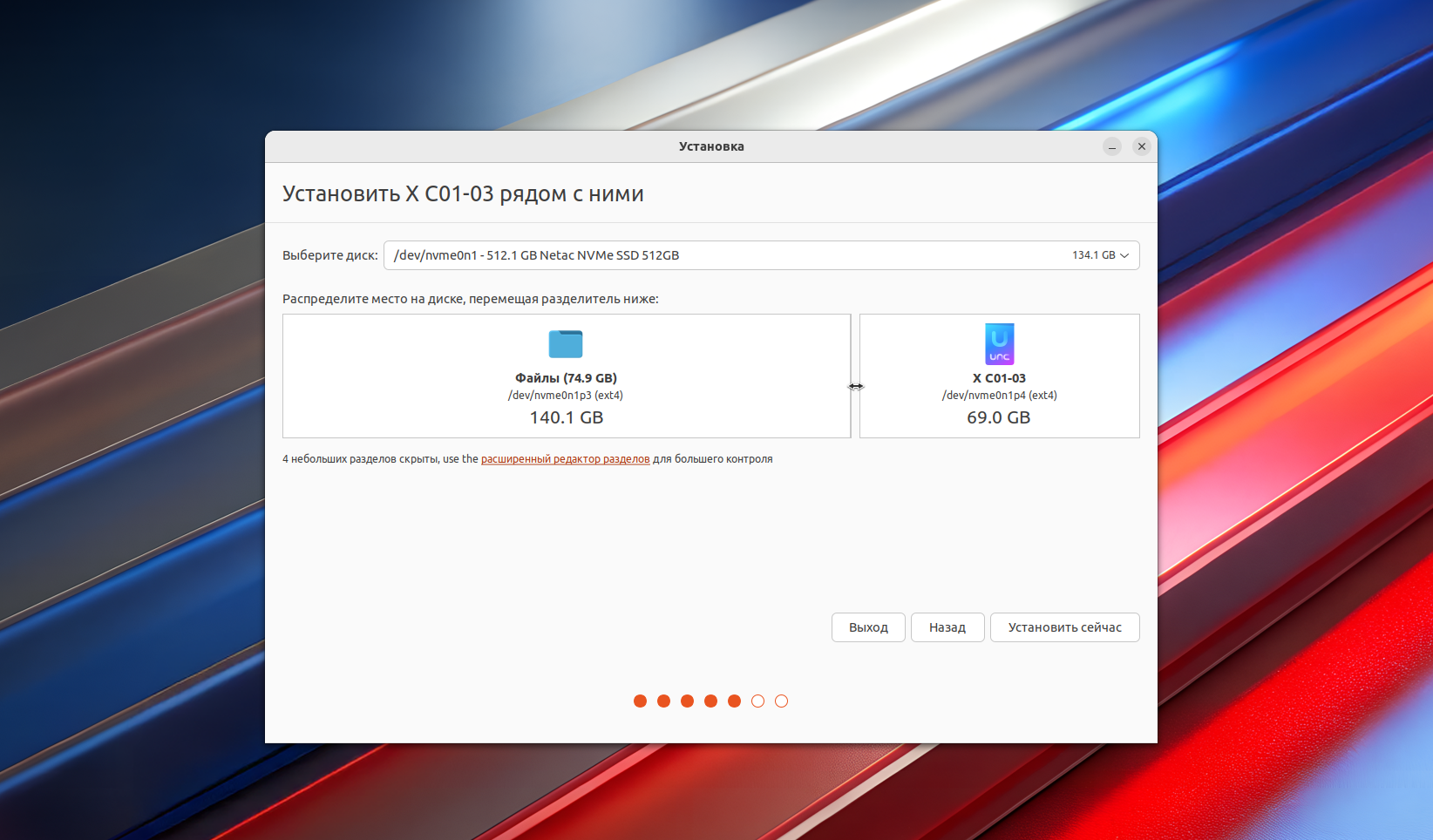 Если вы выбираете вариант совместной установки, то на следующем экране вы можете выбрать диск, на который вы устанавливаете X C01-03, а также какой именно объем дискового пространства выделить под X C01-03. Здесь также присутствует подвижный ползунок, с помощью которого вы можете регулировать объем: