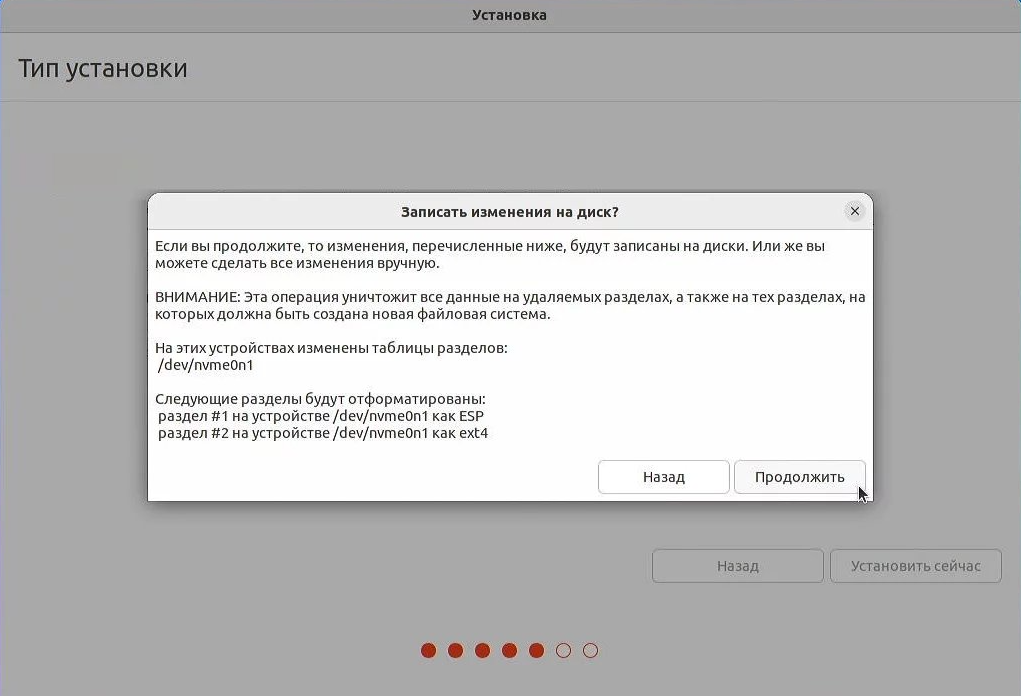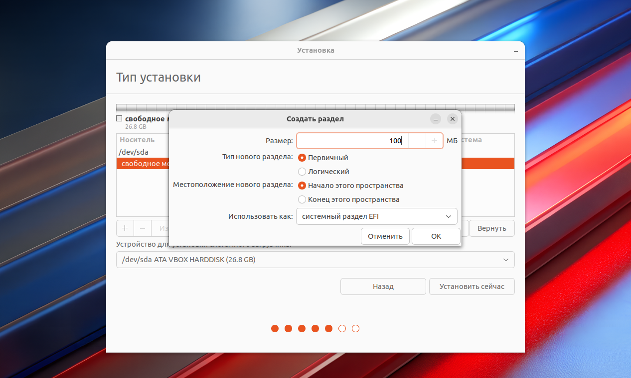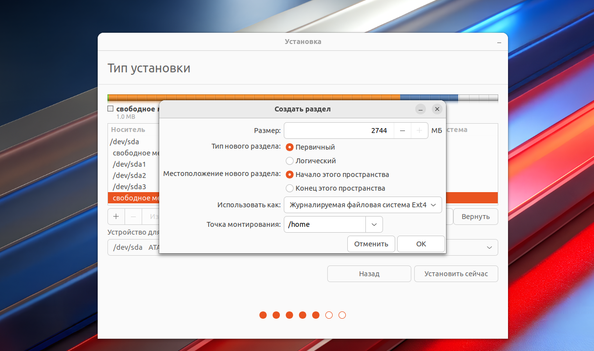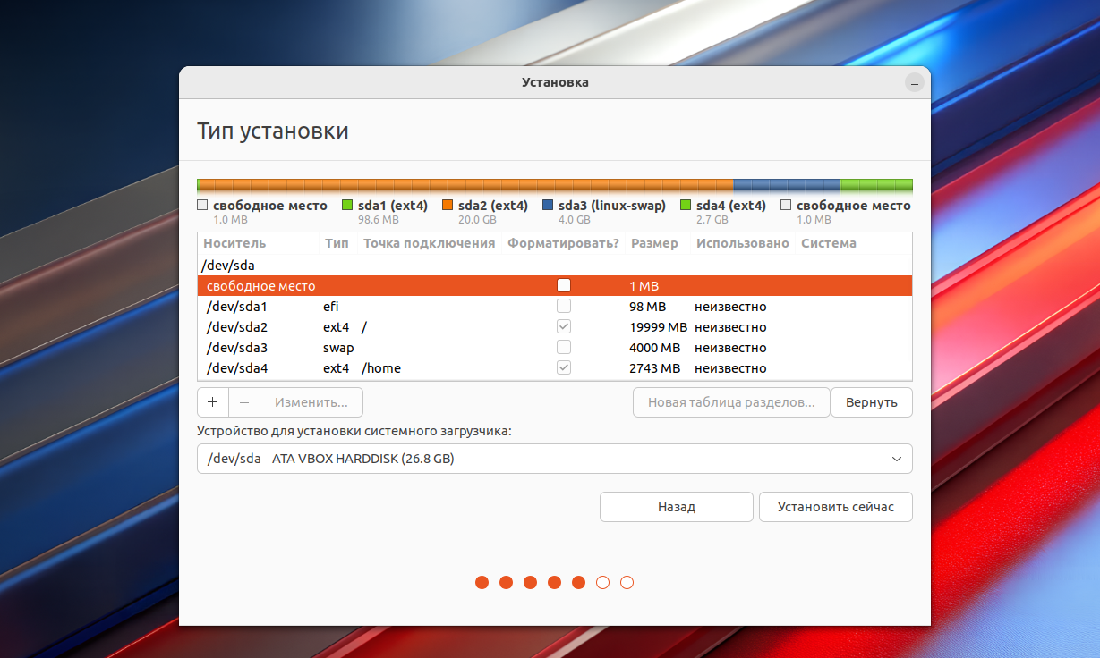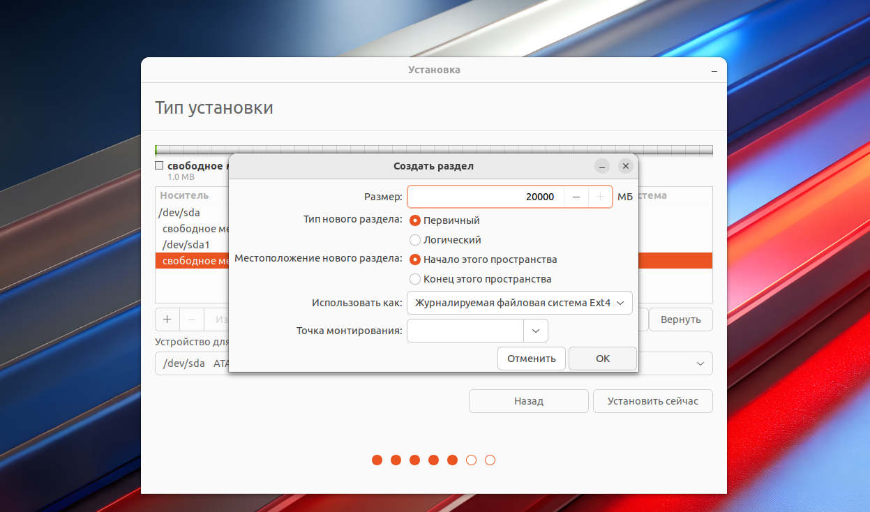 Проверьте корректность настройки разделов и нажмите Установить сейчас.