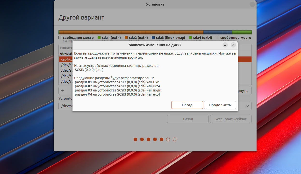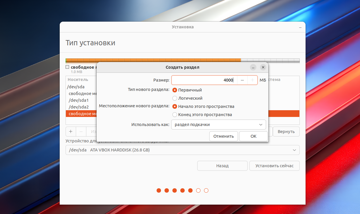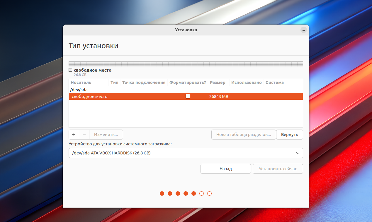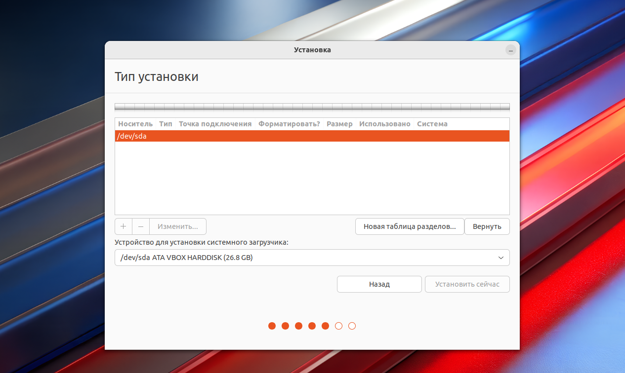 Проверьте корректность настройки разделов и нажмите Установить сейчас.