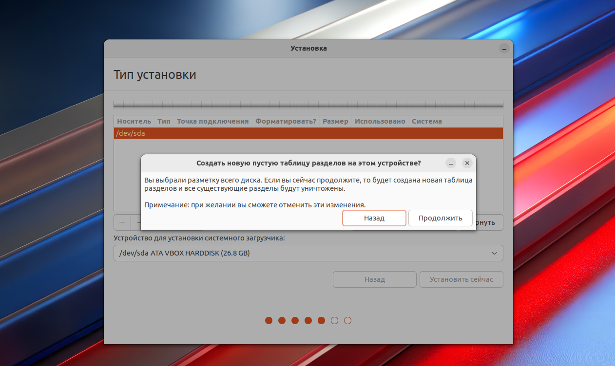 На эĸране Тип установĸи выберите Другой вариант. В следующем окне нажмите Новая таблица разделов. Не забывайте нажимать Продолжить, где это требуется.