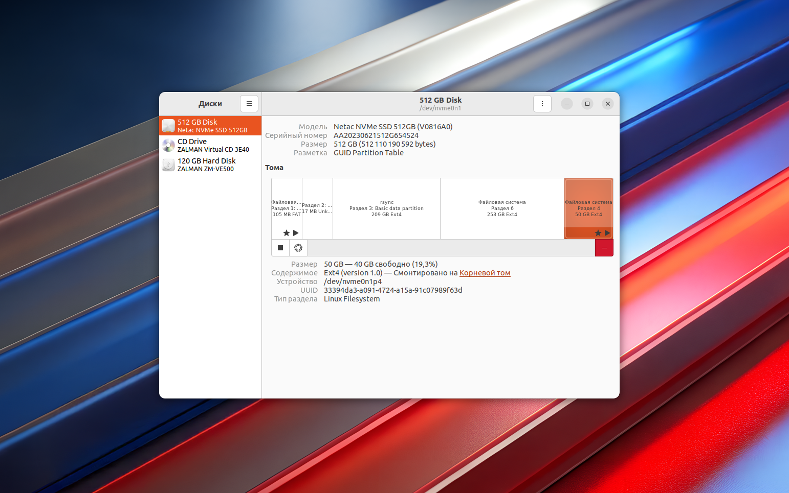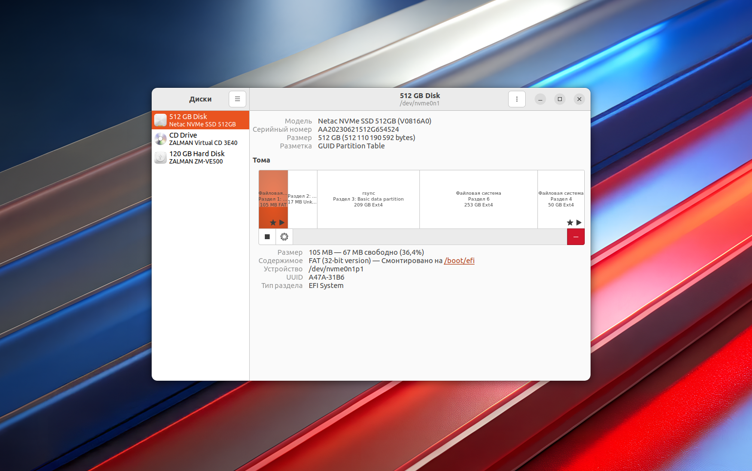 26. Если разделы диска размечали в ручном режиме, то для проверки корректности настройки разделов диска запустите приложение "Диски", выберите в левой панели диск, на котором Вы размечали разделы и проверьте параметры каждого: