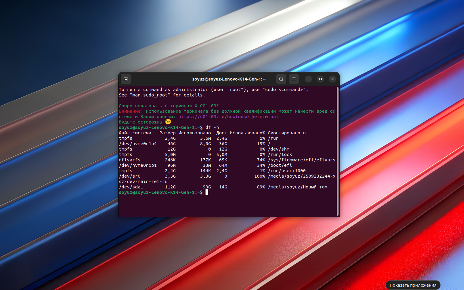 При желании проверить корректность разбиения дисков так же можно через запуск команды в Терминале (опционально):